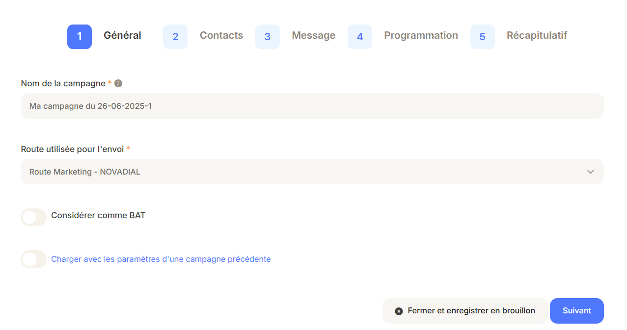 La création d’une nouvelle campagne se fait en cinq étapes.