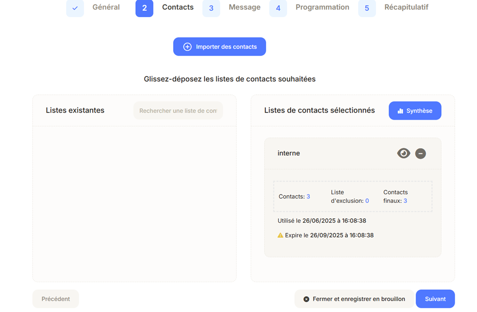 - Utiliser une liste déjà importée et donc présente dans la colonne de gauche. Ajoutez là en drag & drop ou au clic sur le bouton « + ». Des informations comme la date et heure de création, de modification ou de dernière utilisation de cette liste vous sont délivrées. Ici le bouton « Synthèse » prend tout son sens puisqu’il affiche les données consolidées de l’ensemble des listes que vous avez sélectionnées.