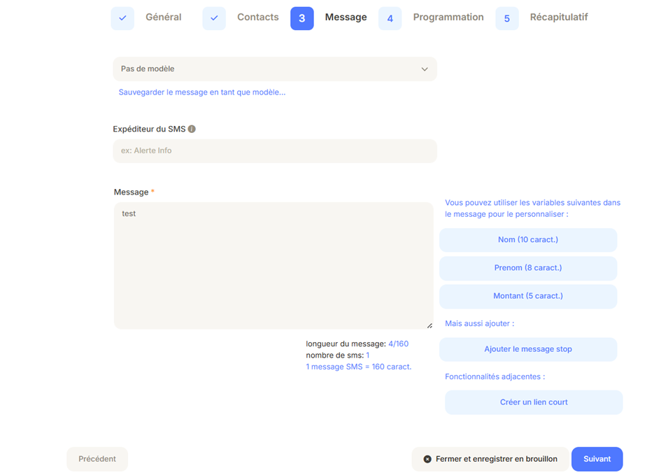 En bas à droite du bloc de saisie, la longueur du message et le nombre de SMS nécessaires pour router ce message s’affichent et se mettent à jour en temps réel de votre saisie.