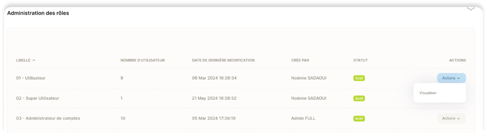 Au clic sur le bouton Visualiser du bouton sélecteur Actions, visualisez le détail des droits associés à un rôle.