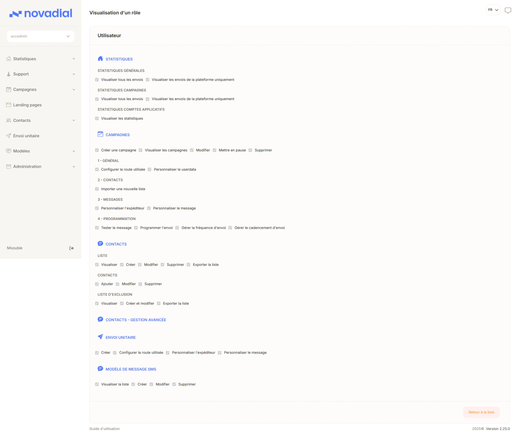 Par rubrique, retrouvez la liste précise de chacun des droits activés sur ce rôle.