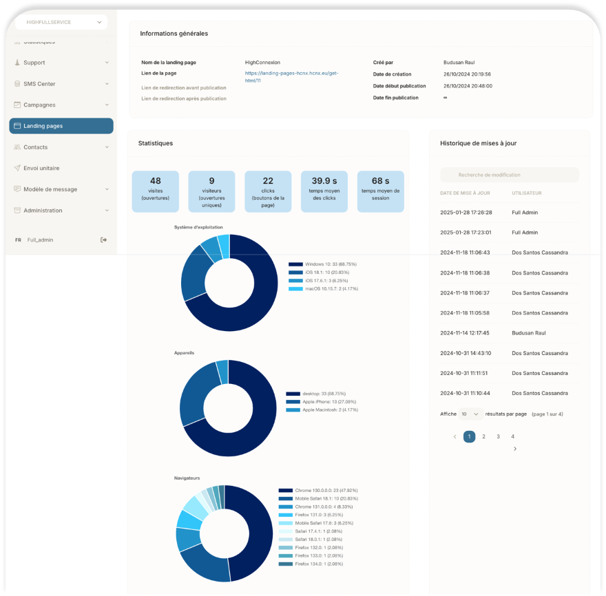 Les statistiques associées à la page vous permettent de visualiser en un clin d’œil les indicateurs clés en temps réel. Vous y retrouvez également l’historique de modification de la page, ainsi que des rapports téléchargeables avec le détail des interactions sur la page, les données collectées du formulaire et les interactions avec les store locator.