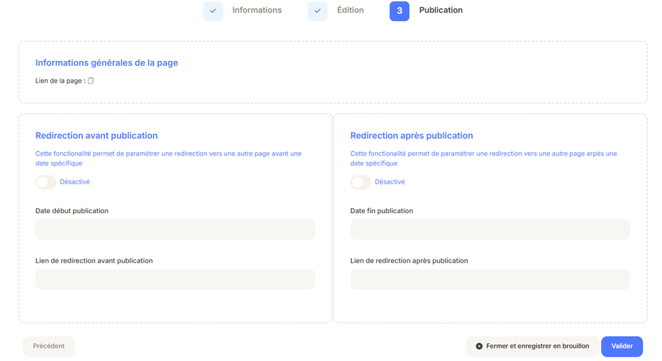 Des redirections vers d’autres pages peuvent être mises en place en fonction des dates de publication souhaitées